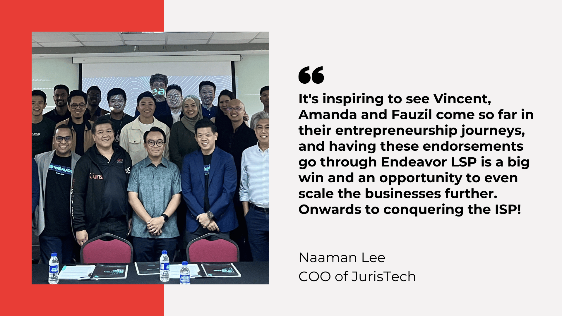 Naaman Lee, COO of JurisTech, Invited to Endeavor Malaysia’s 2023 Local Selection Panel As a PanellistOur COO, Naaman Lee, has been invited to Endeavor Malaysia's 2023 Local Selection Panel. Read on to find out which companies have passed this year's LSP.By Ming Yih|2023-06-23T14:13:52+08:0017th May, 2023|News| Read More