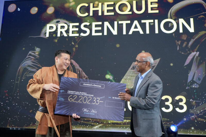 JurisTech’s CEO, See Wai Hun, and COO, Naaman Lee, present a mock cheque to Rumah KIDS on stage.
