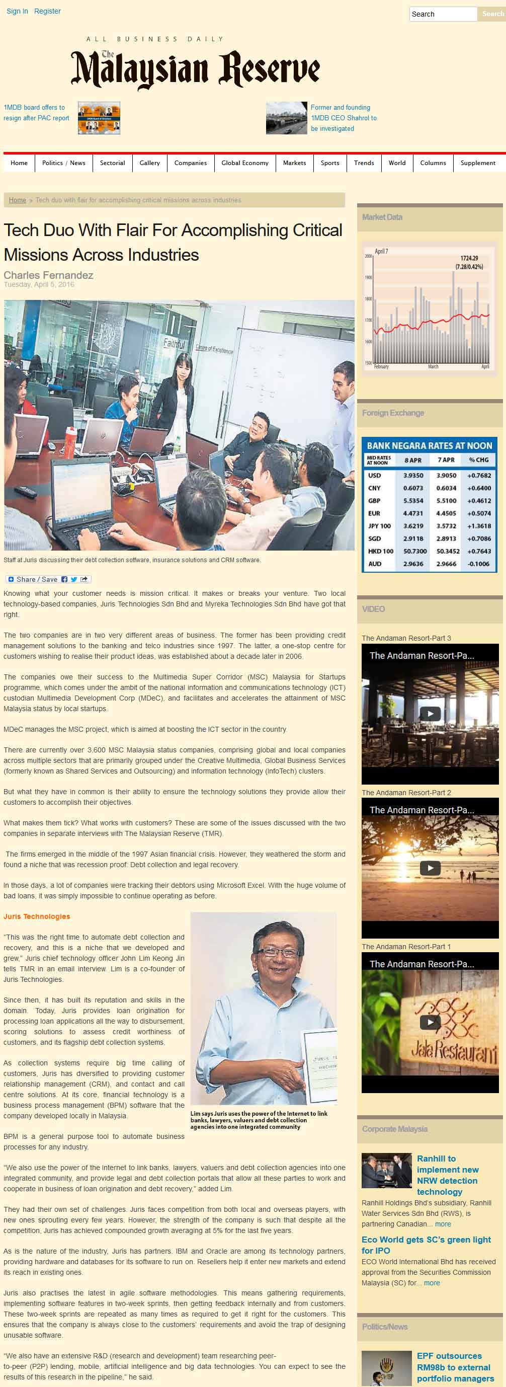 JurisTech Featured in The Malaysian ReserveThe Malaysian Reserve business daily discovers how JurisTech became a catalyst in the way traditional banks manually process debt collections and recovery at the height of the financial crunch in the year 1997.“..this was the right time automate debt collection and recovery, and this is a niche that we developed and grew,” JurisTech’s chief technology officer John Lim Keong Jin tells TMR in an email interview. Lim is a co-founder of JurisTech.JurisTech is the leading banking solutions provider in Malaysia with 13 years of experience in the industry. The company has deeply carved its name in the banking technology market with its Fintech Solutions widely used by 20 banks (and counting) in Malaysia and envisions the company to be the best credit management software provider in the world.Today, JurisTech, with its Center of Excellence has a group of Software Engineers and Data Scientists rigorously working on software technology and R&D on Peer-t0-peer (P2P) lending, mobile, artificial intelligence, and Big Data analytics.The Malaysian Reserve is an all-business daily that provides the latest buzz in the business world be it a snippet of information or an opportunity. A well-read publication by senior management, businessmen, policymakers and high net worth individuals who make the decisions.The circulation touches news about businesses, stocks, markets, technology, investments and wealth management.Related Articles: The Debt Collector, The Edge, The StarBy JurisTech|2022-03-21T13:27:02+08:0011th April, 2016|News| About the Author: JurisTech The Marketing & Communications team at JurisTech comprises skilled digital marketing strategists and content creators who deliver invaluable insights drawn from our experts in lending and recovery software solutions. For media queries, please contact us at mac@juristech.net. Related Posts Alliance Bank Goes Live with AI-Enabled Loan Origination System from CTOS and JurisTech 18th November, 2025 JurisTech Hosts Industrial Visit from Universiti Teknologi PETRONAS 24th September, 2025 Bridging the Trust Gap with AI: JurisTech Champions Financial Inclusion at CIBI IMPACT 2025 21st August, 2025
