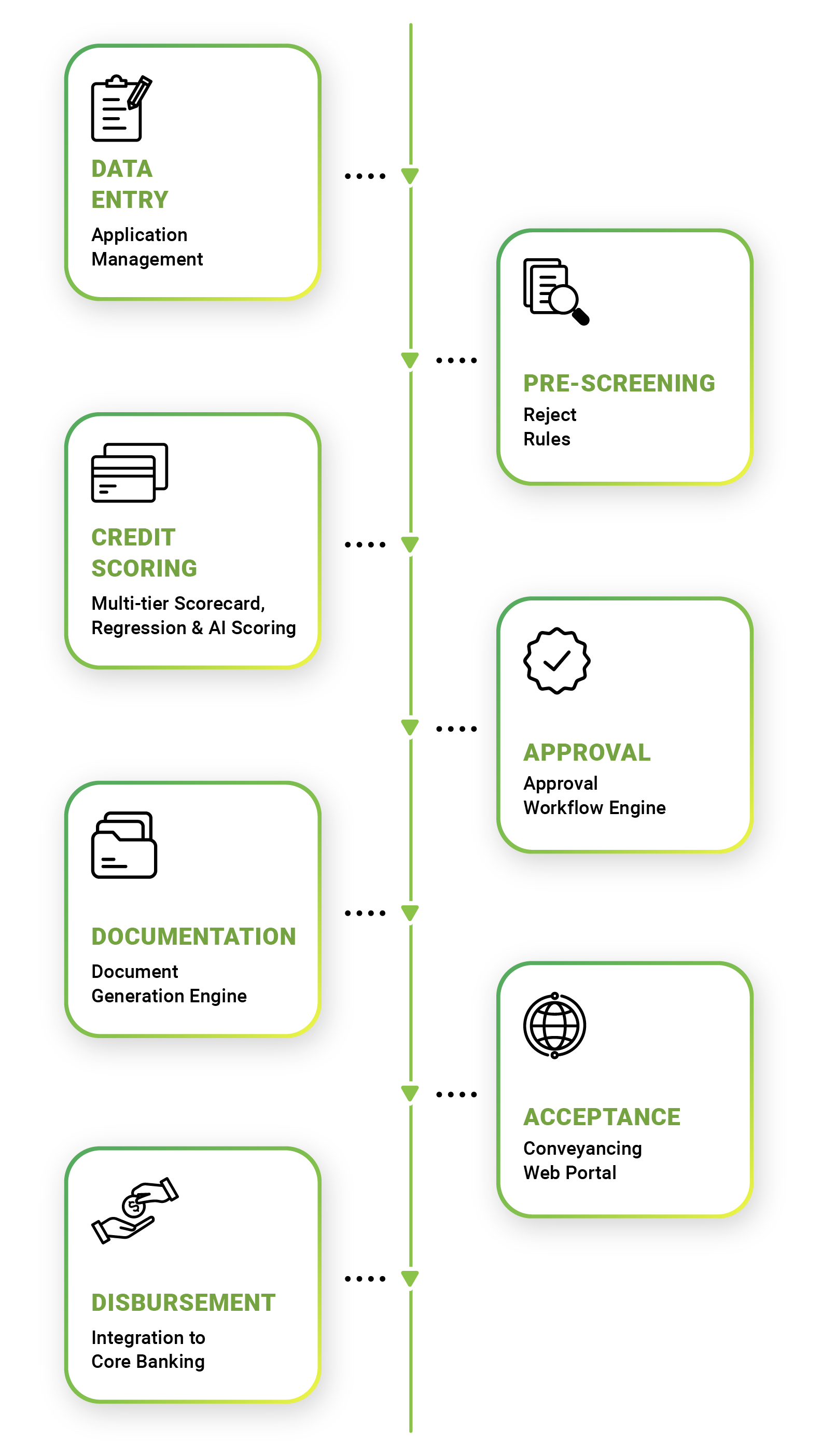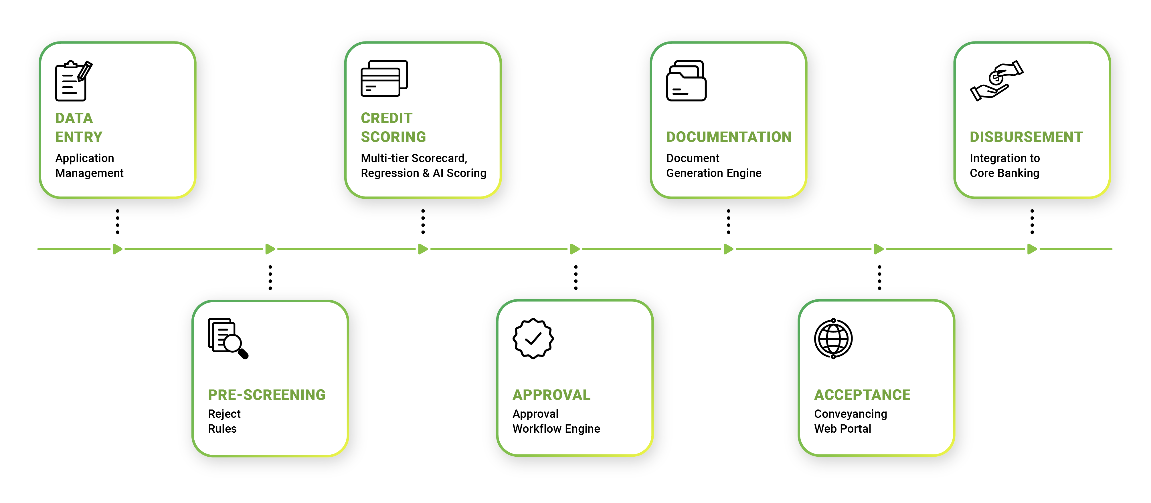 Robust straight-through processing, that covers everything from data input, pre-screening, credit-scoring, approval process, documentation, acceptance to account creation, disbursement for insurance, conventional loan, and Islamic financing.