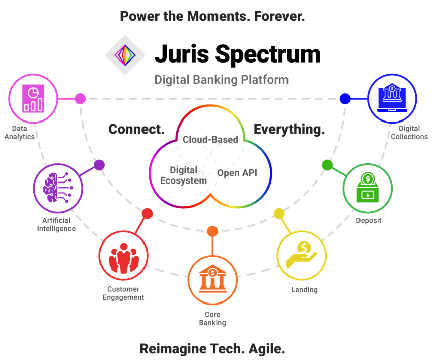 Juris Spectrum is an end-to-end digital banking platform, offering a unique, holistic digital banking experience for customers and businesses. Powered by connectivity and agility, Juris Spectrum is composed of a robust digital core and state-of-the-art customer engagement, lending, deposits, and collection capabilities.